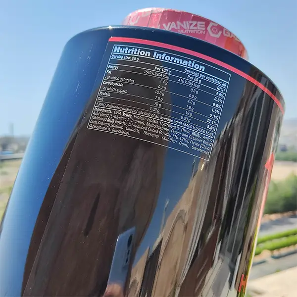 • هر وعده ( 1 پیمانه / 32 گرم ) حاوی 120 کالری، 2/1 گرم چربی کل، 1/4 گرم کربوهیدرات کل، 24 گرم پروتئین، 22/9 گرم BCAA  در هر 100 گرم